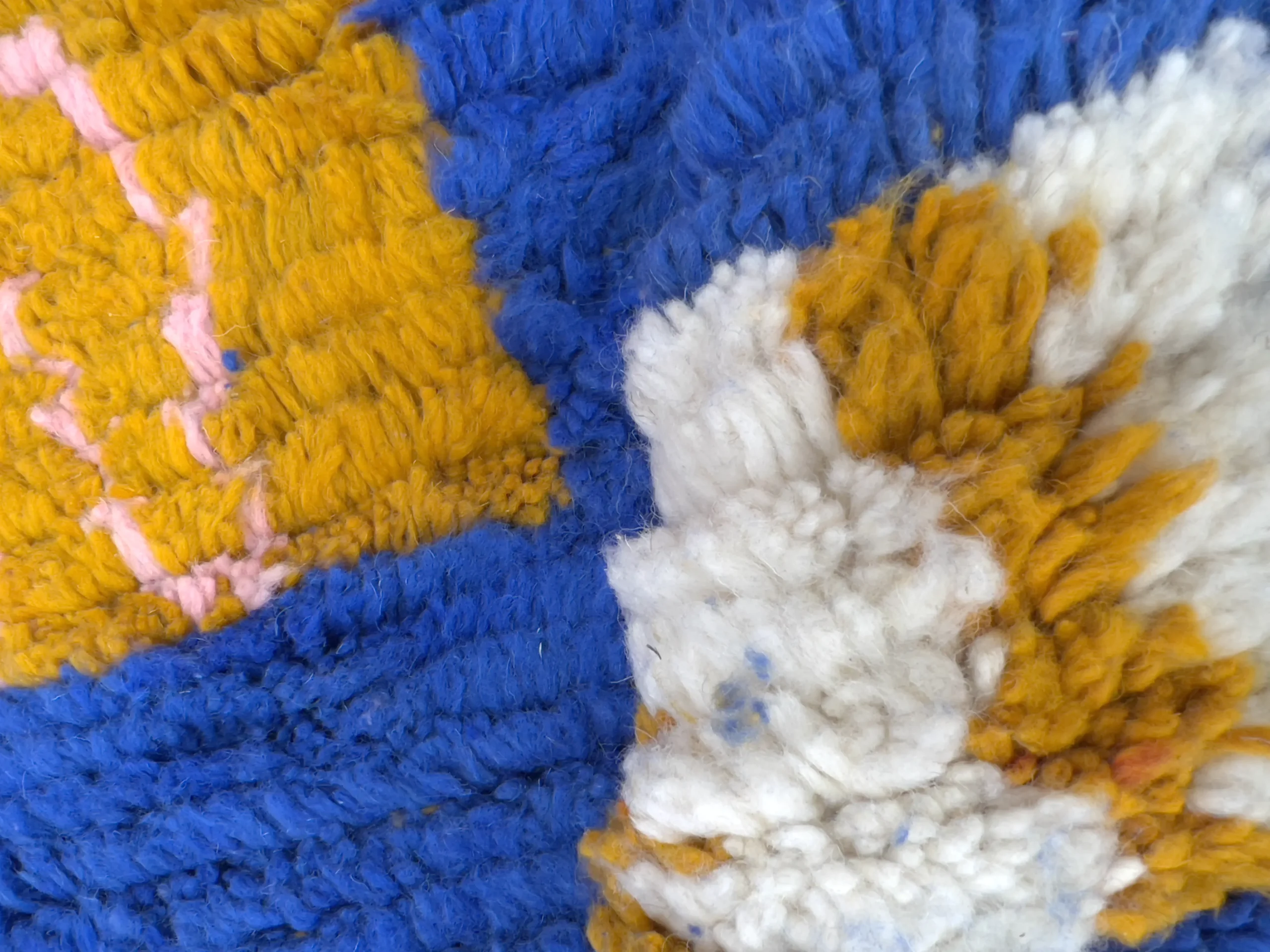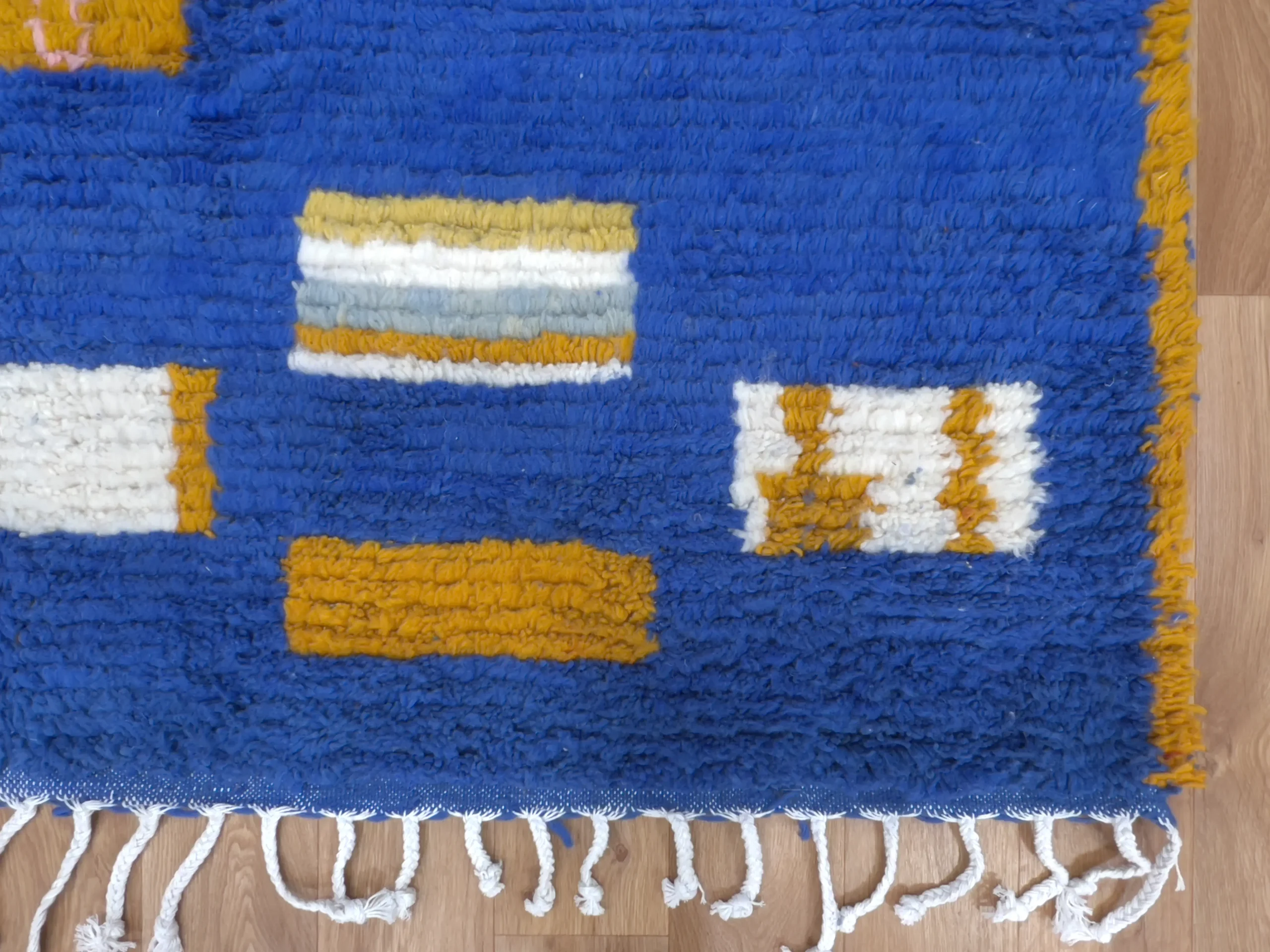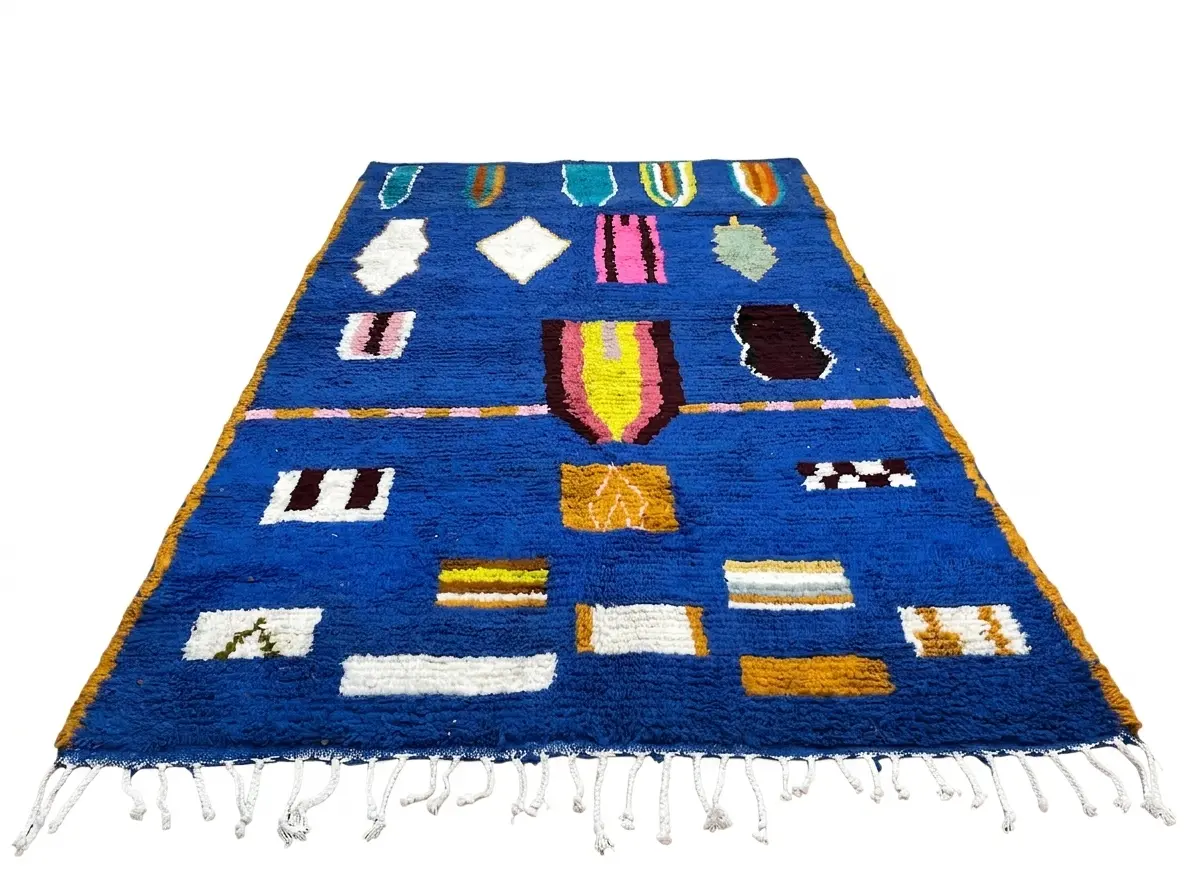 Elegant handmade Boujad rug with a deep blue background and colorful Berber motifs. Crafted from natural wool, this unique Moroccan piece brings calm, character, and modern bohemian style to any space.