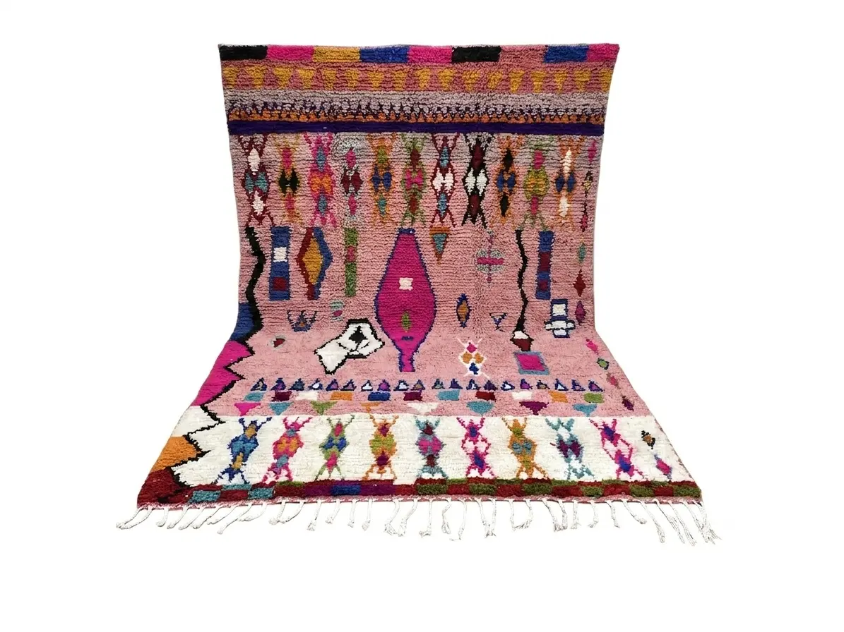 Authentic handmade Boujad rug from Morocco, featuring vibrant Berber patterns on a soft pink background. Crafted from natural wool, this unique artisan piece brings warmth, character, and elegance to any space.